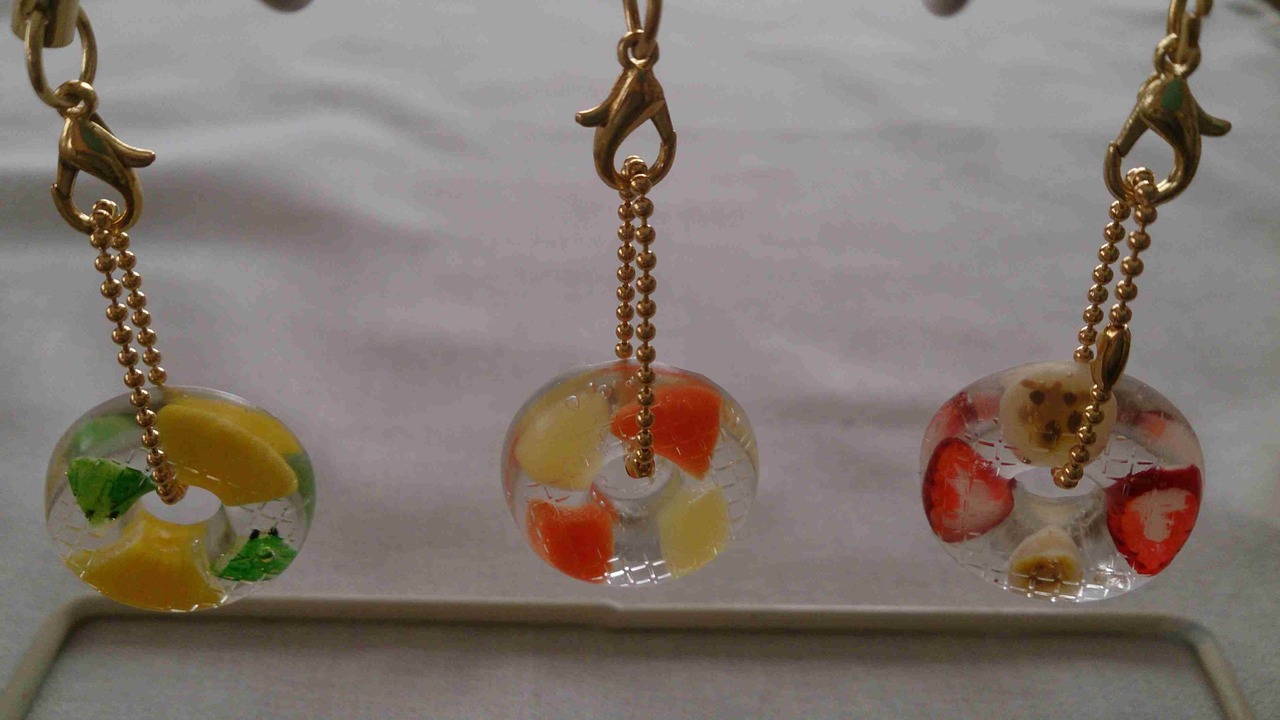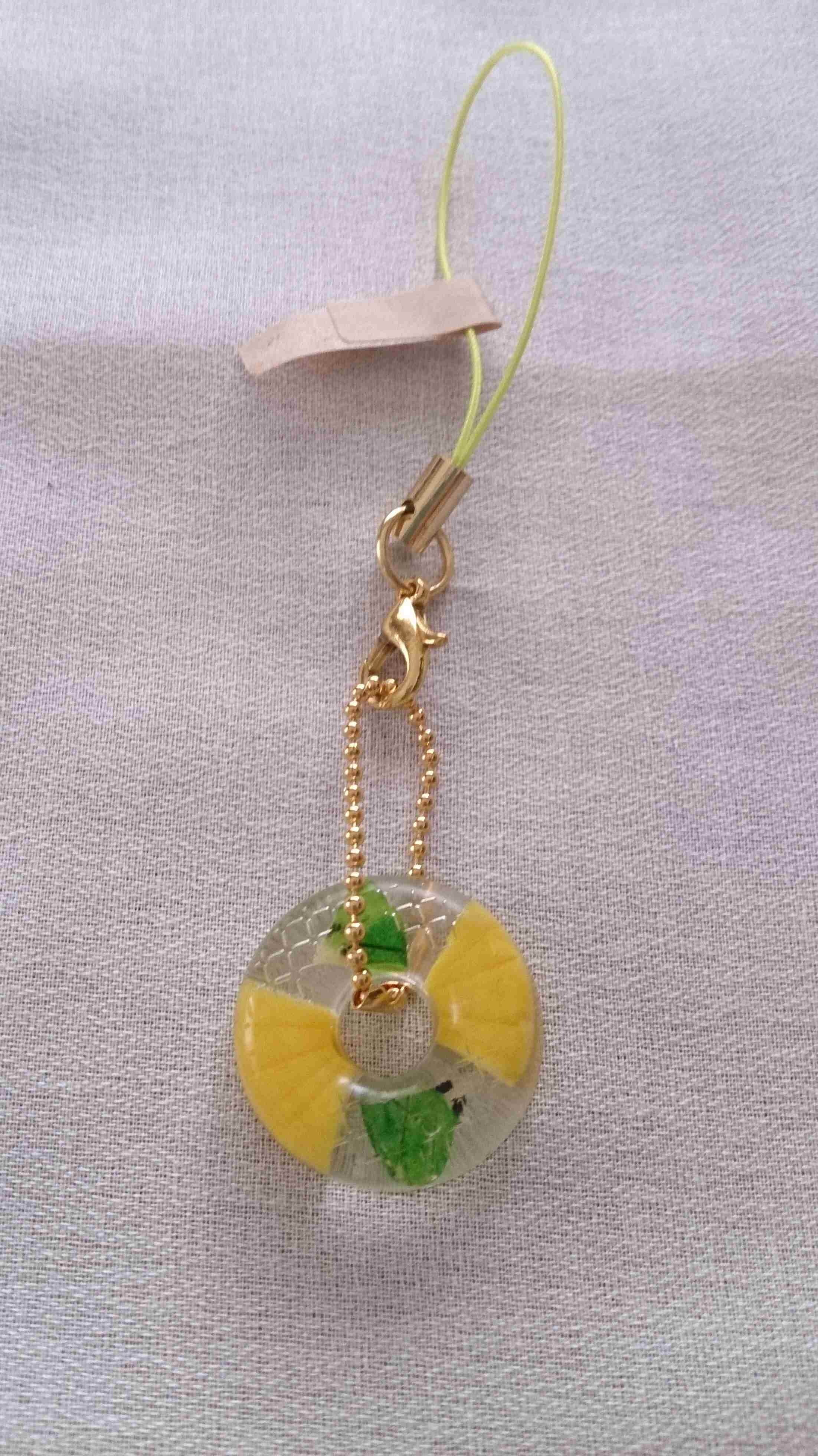 樹脂粘土で作ったキュウイとパイナップルを入れ、レジンで閉じ込めたドーナツ型のストラップです。 とても涼しげな商品です。 直径2.3センチ