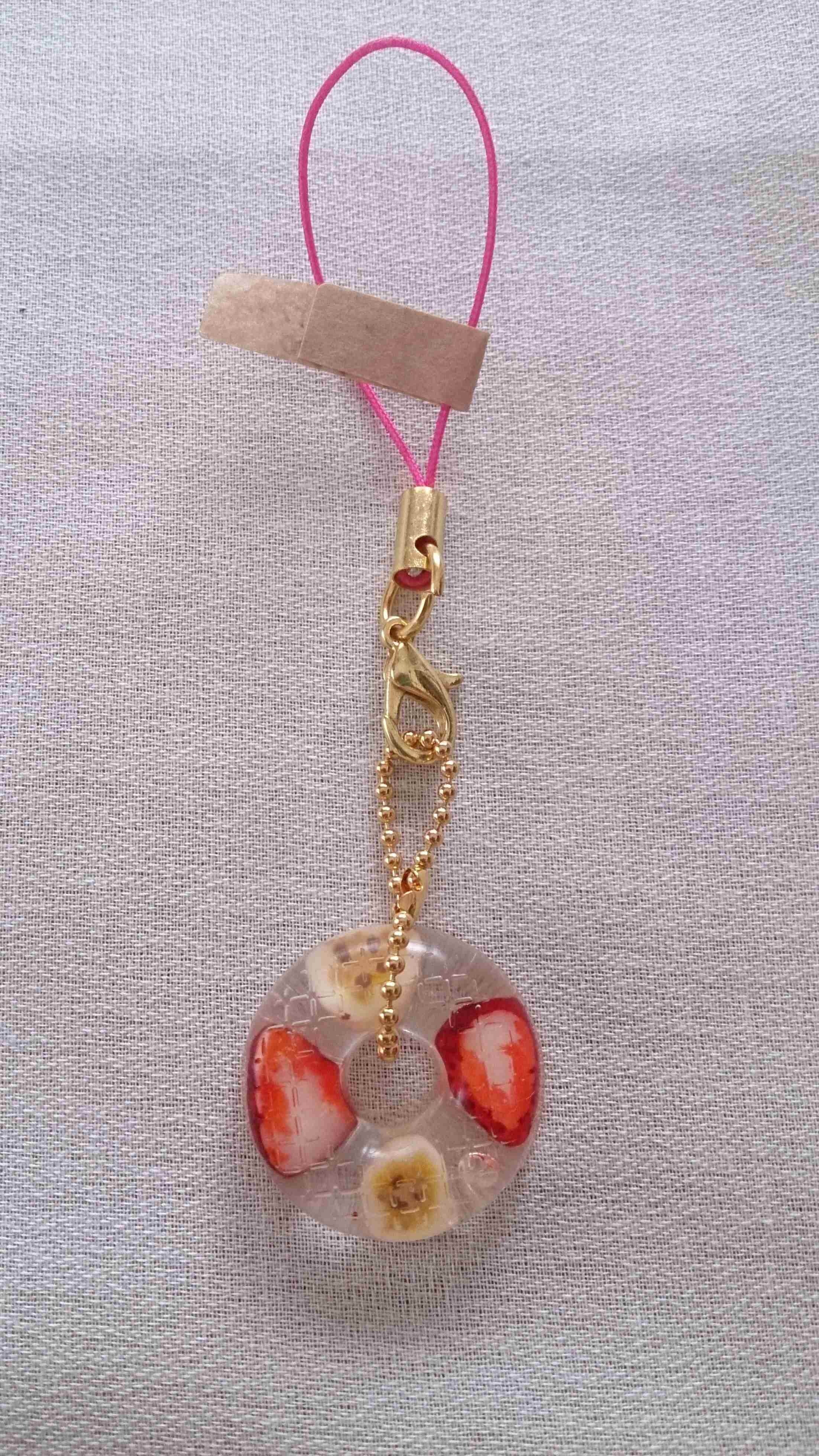 樹脂粘土で作ったストロベリーとバナナをレジンで閉じ込めたドーナツ型のストラップです。 涼しげな商品です。 直径2.3センチ