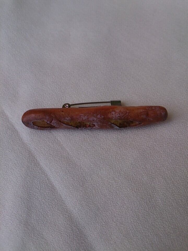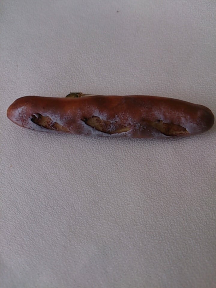 ミニチュアフランスパンのブローチです。 樹脂粘土でなるべくリアルに制作しました。 洋服や布バックのアクセントなどにいかがでしょうか☆ 約5.5cm