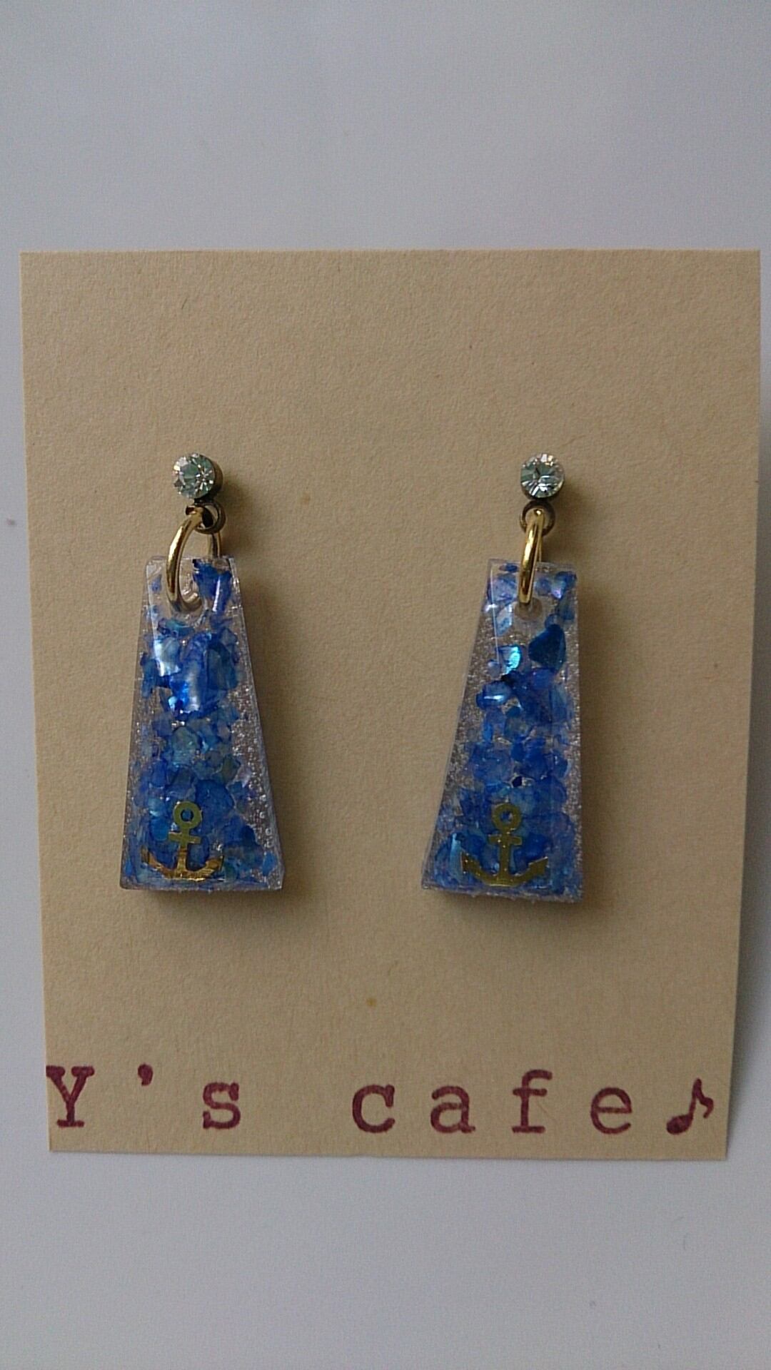 ブルーのクラッシュシェルをレジンで閉じ込めたシンプルなピアスです。
