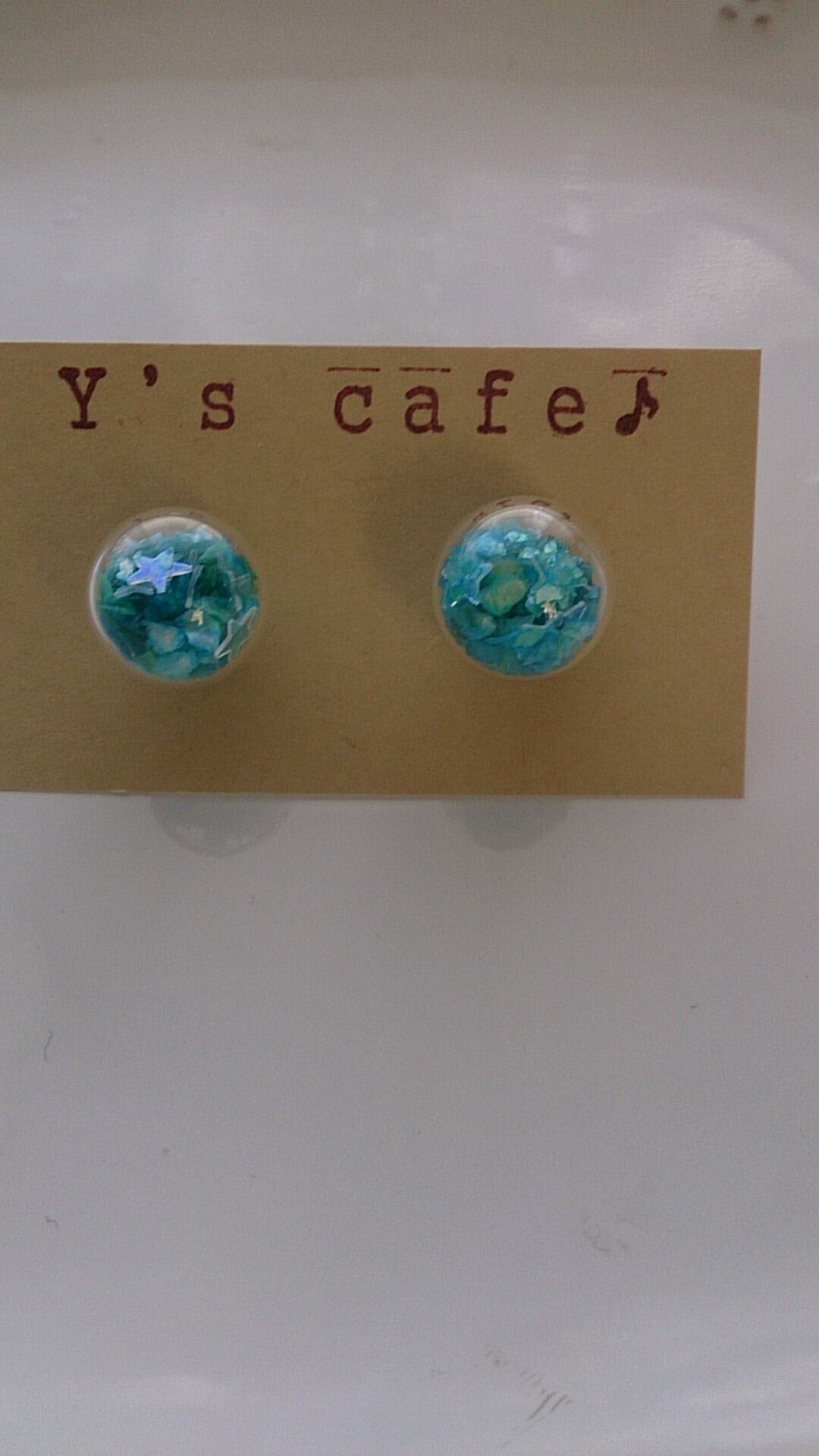 ミニのガラスドームにブルーグリーンのクラッシュシェルに透明の星形パーツを 閉じ込めました。 涼しげでかわいいピアスです☆ 約1cm