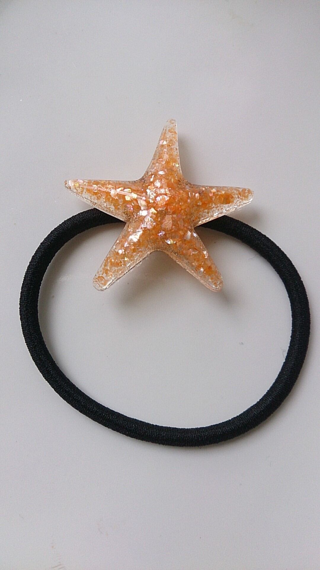 オレンジのクラッシュシェルをレジンで閉じ込めたスターフィッシュ型のヘアゴムです。 夏のおしゃれのアクセントにいかがでしょうか。 約3cm