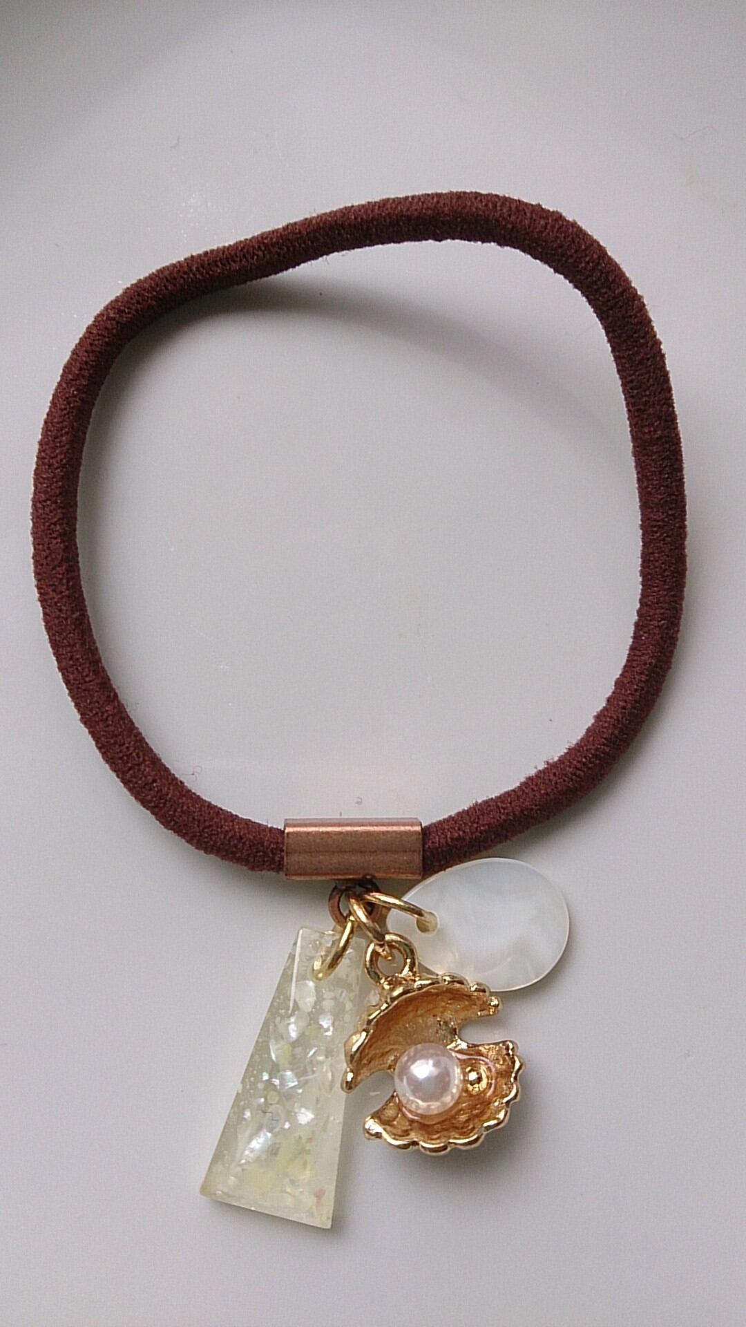 ホワイトのクラッシュシェルをレジンで閉じ込めたパーツとパールいりのゴールドーシェルのチャーム、しずく形シェルパーツをつけ、ヘアゴムにしました。