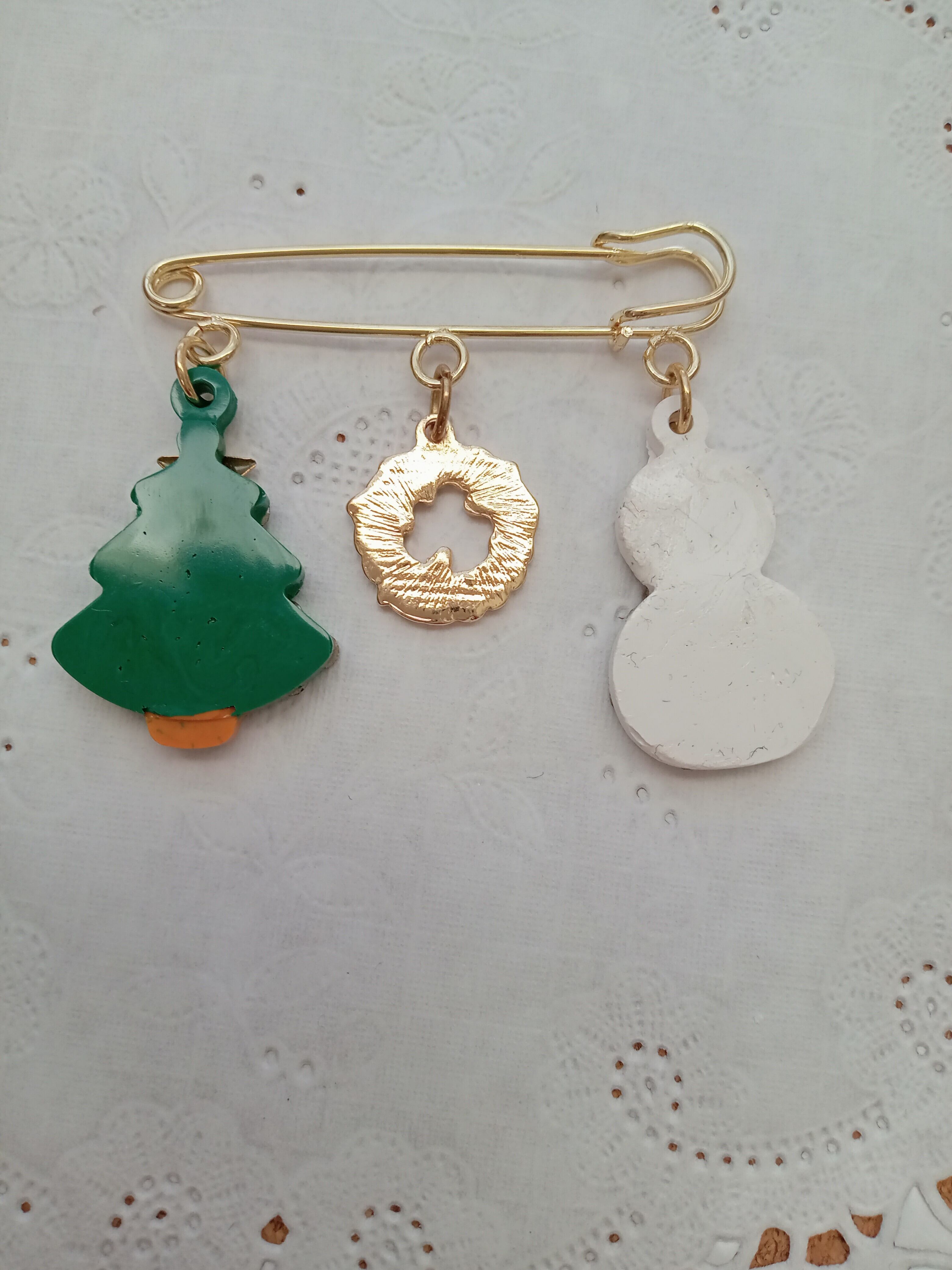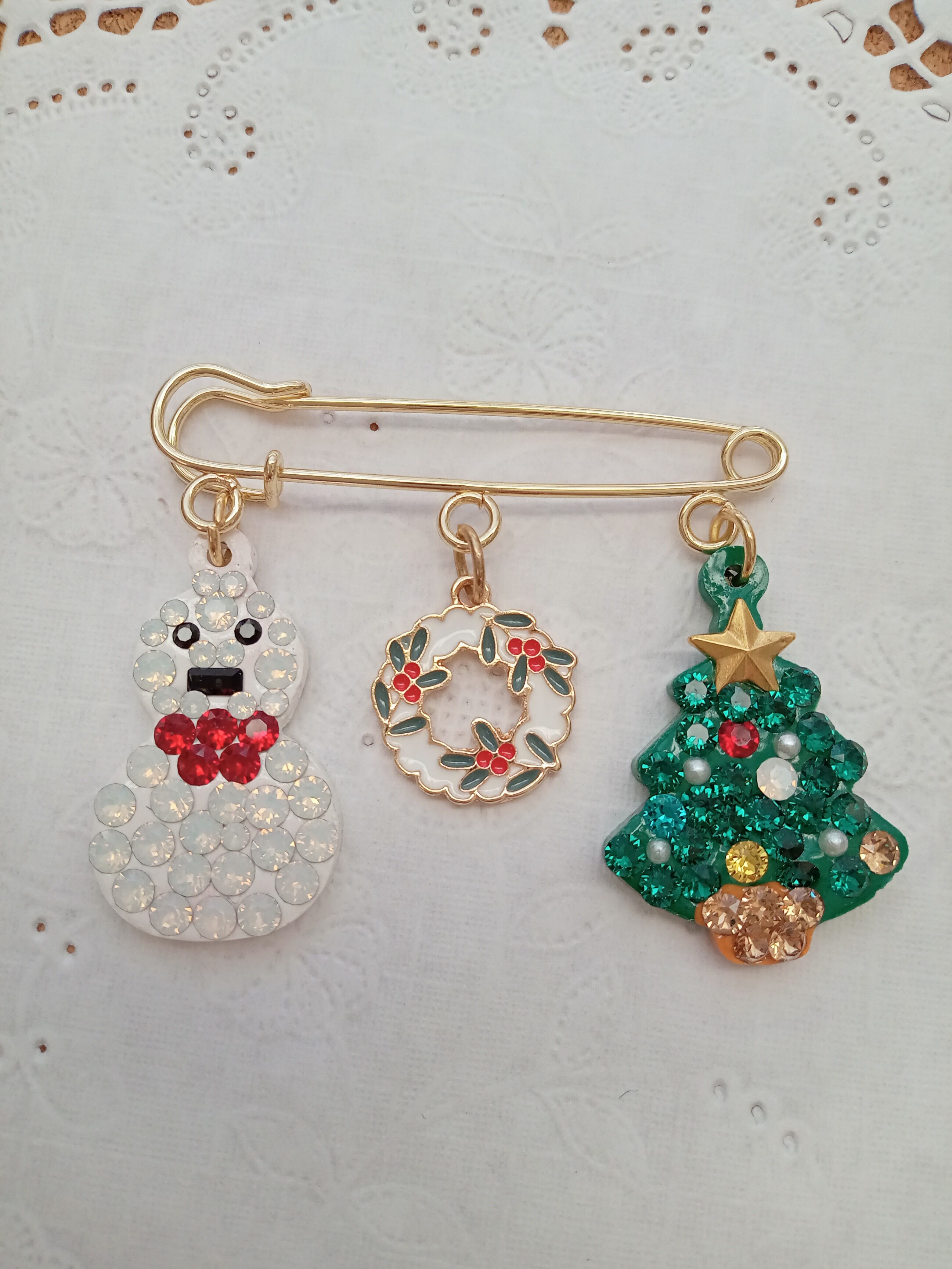 スワロフスキー・クリスタルの石を使用して製作いたしました、スノーマン&クリスマスツリーにチャームを付けたブローチになります。