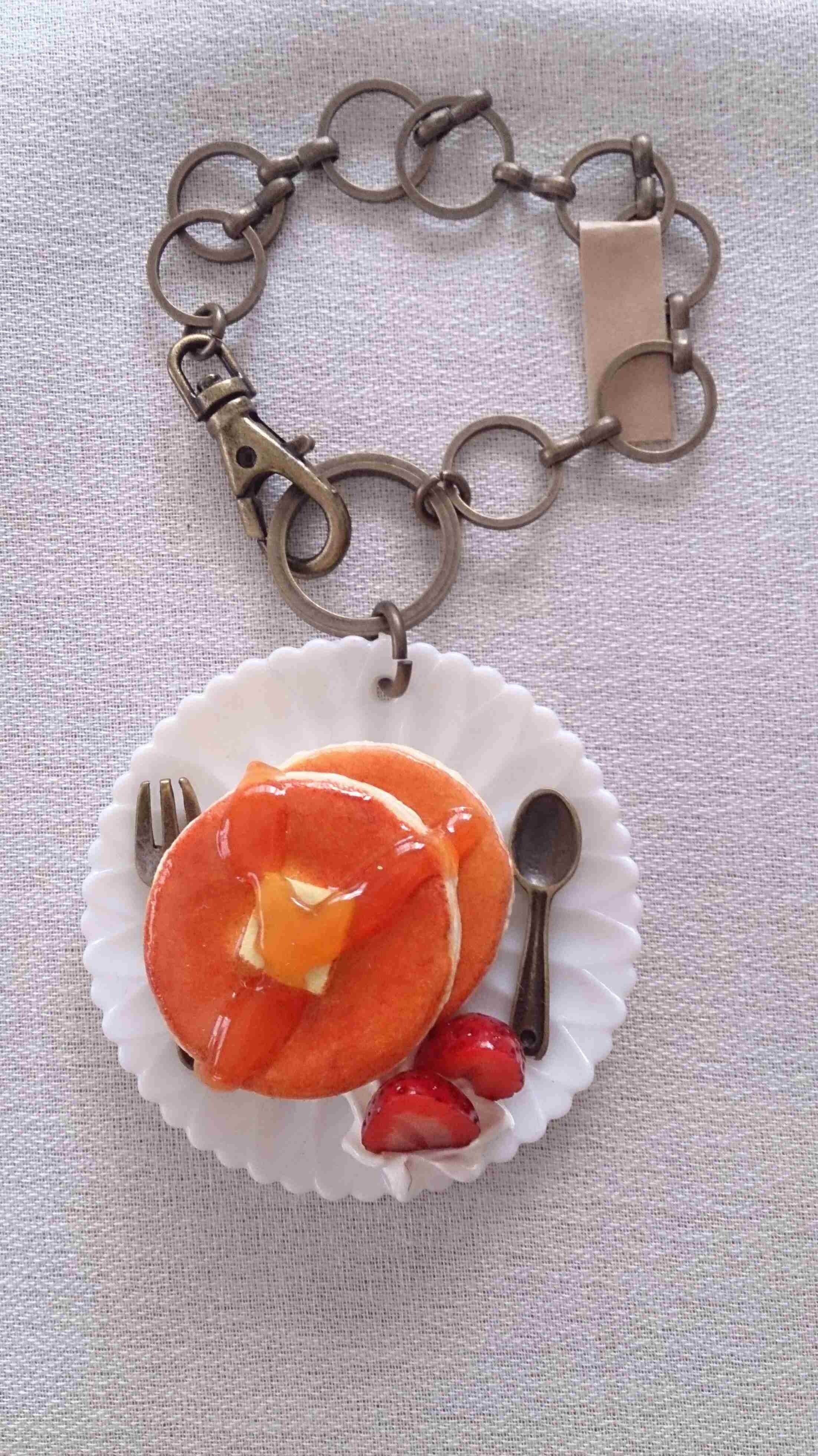 軽量、樹脂粘土、アクリル絵の具を使用したイチゴ添えのお皿にのったパンケーキバッグチャームです。