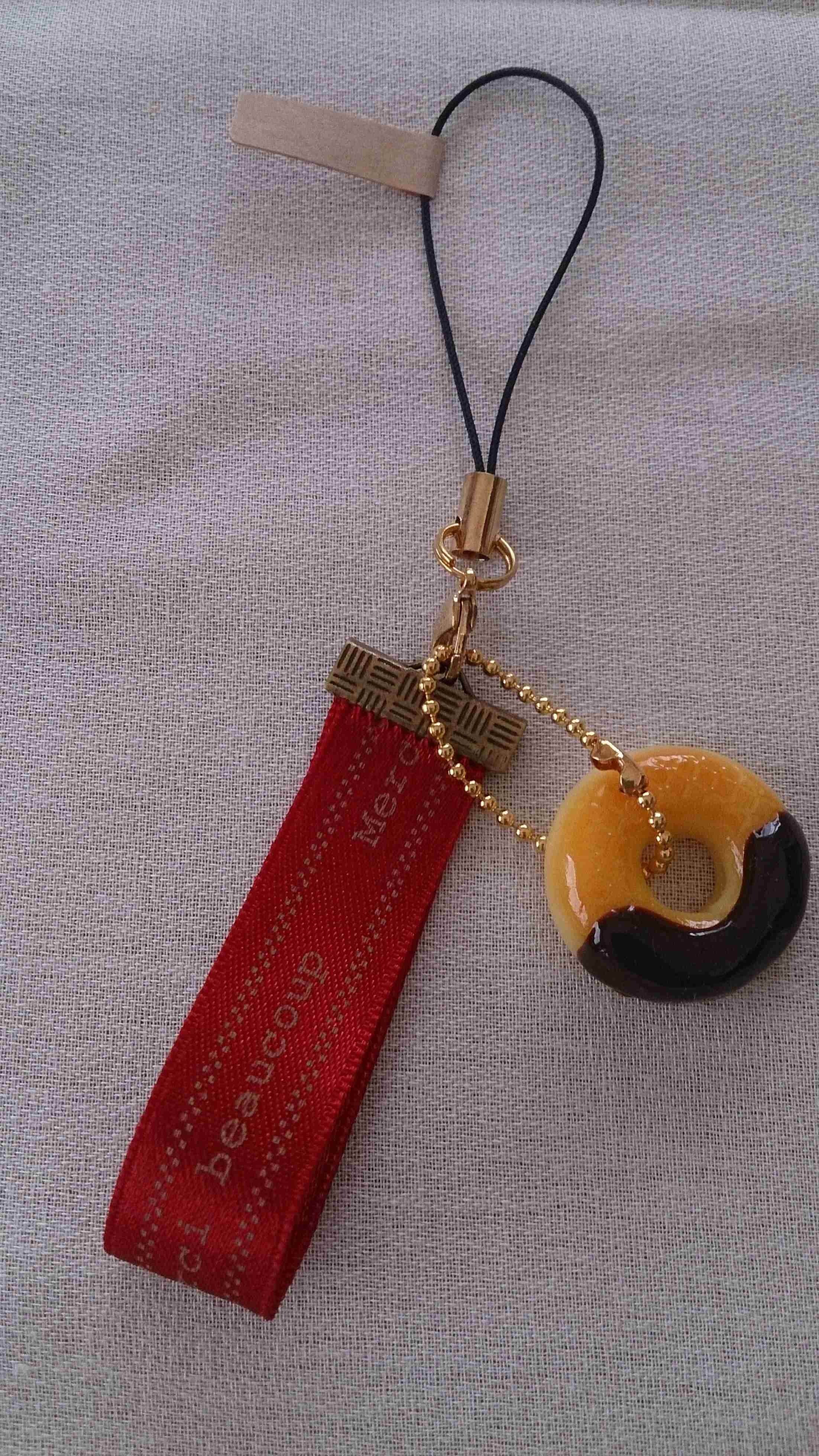 樹脂粘土を使用した、チョコがけドーナツストラップです。