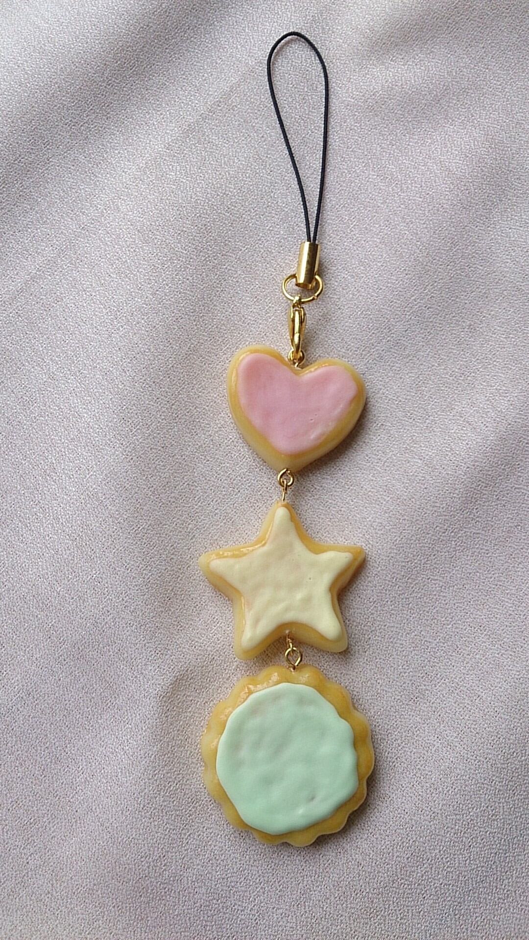 樹脂粘土を使用した3種の形のアイシングクッキーを3連につなげたストラップです。