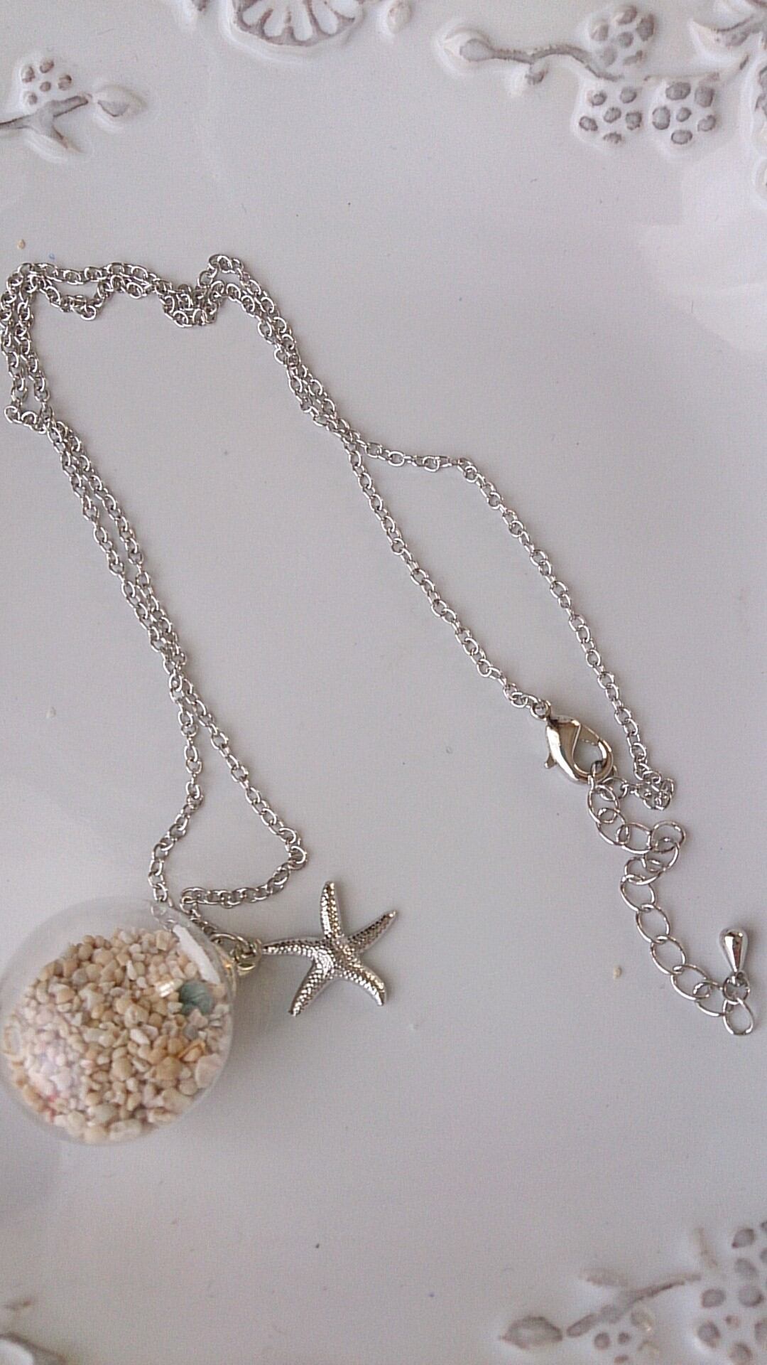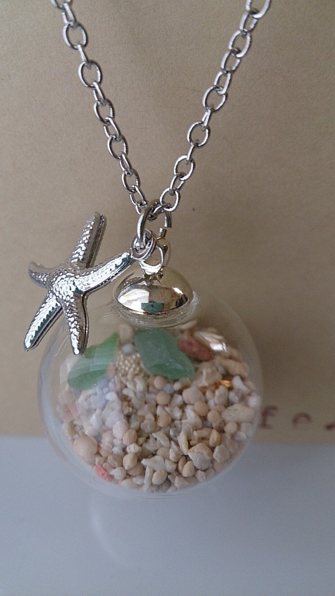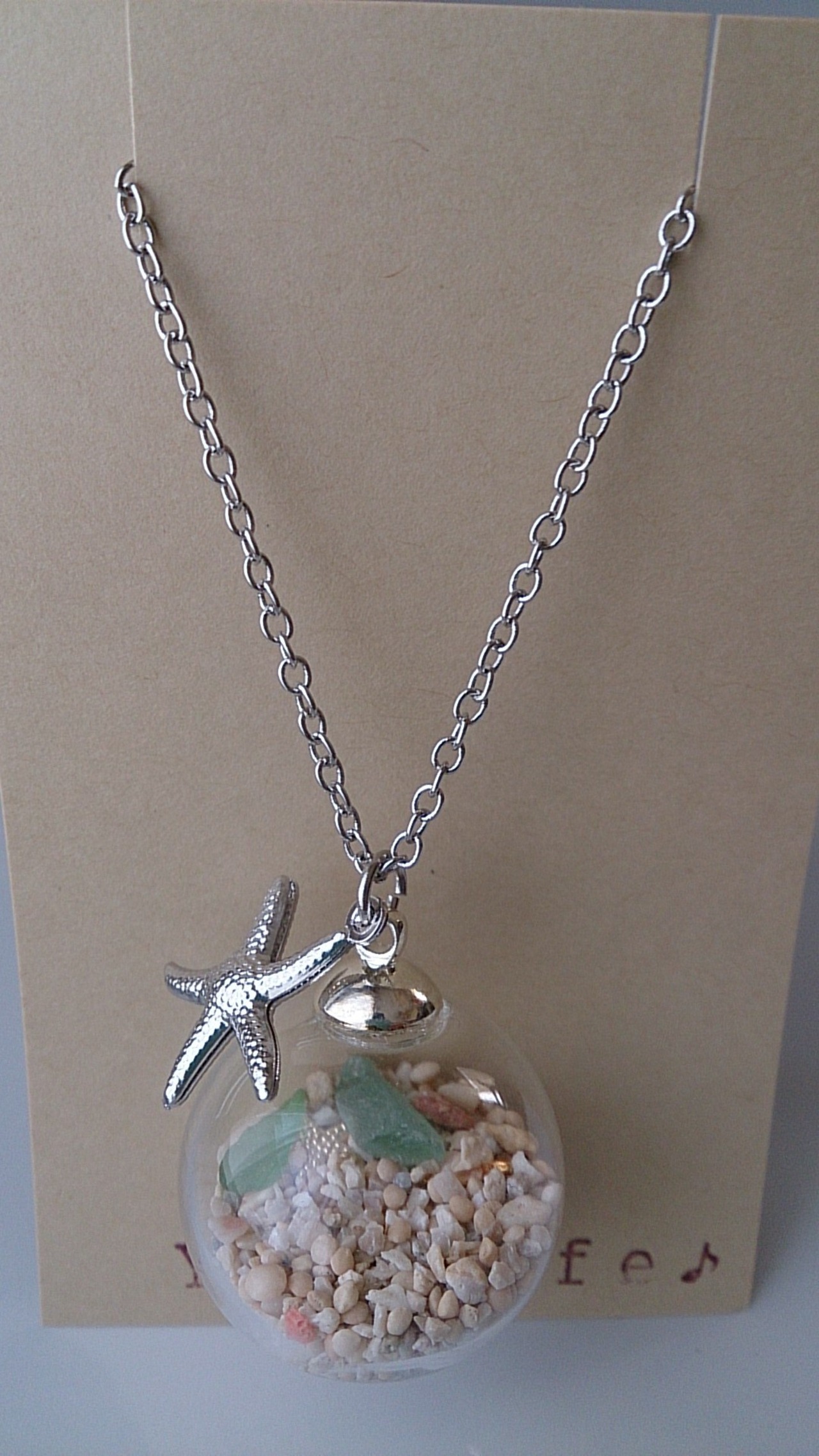 ガラスドームの中にサンゴ入りの砂、緑・水色のシーグラス、ゴールドの貝2種類とヒトデのパーツを入れてアレンジしました。