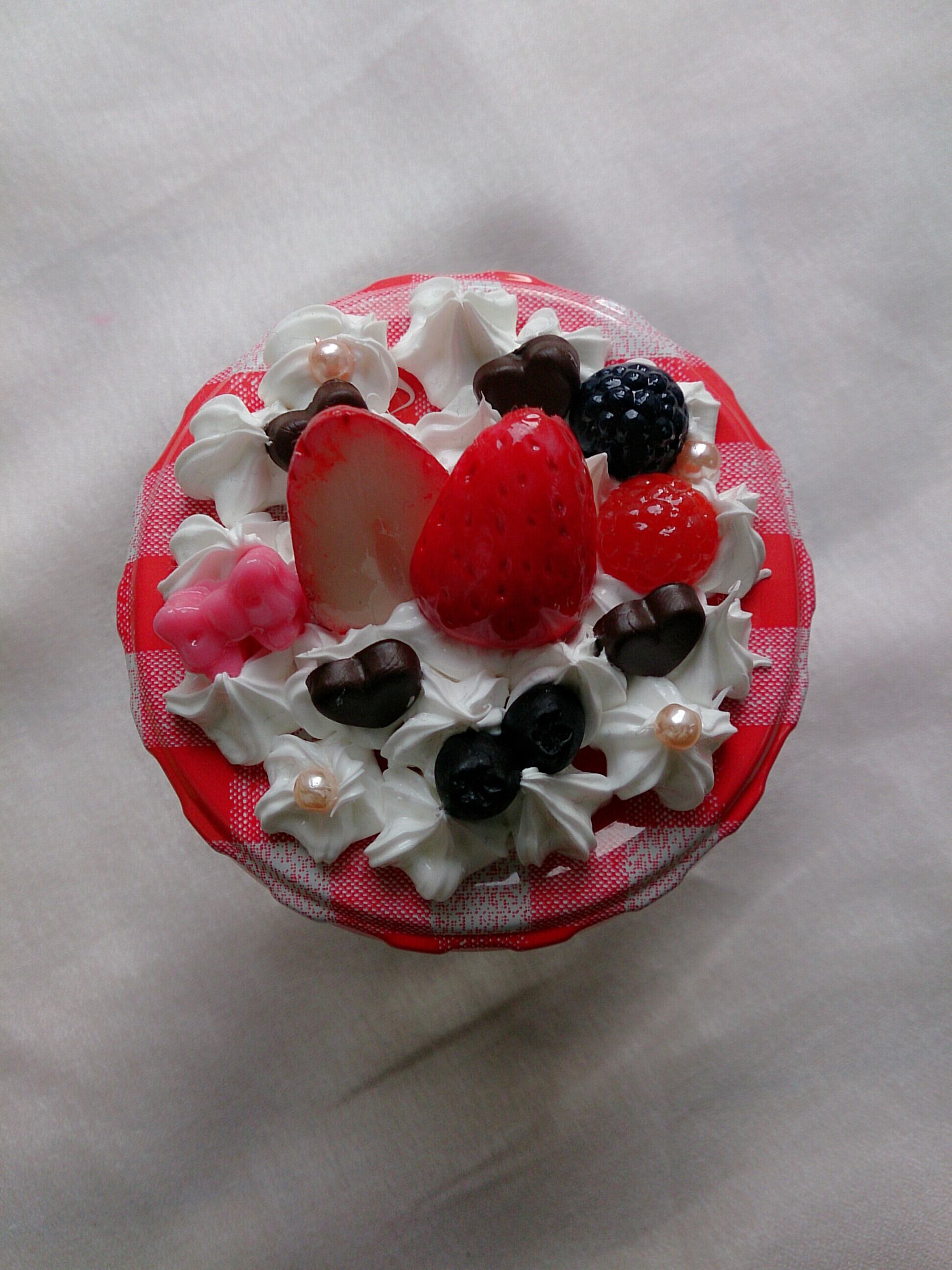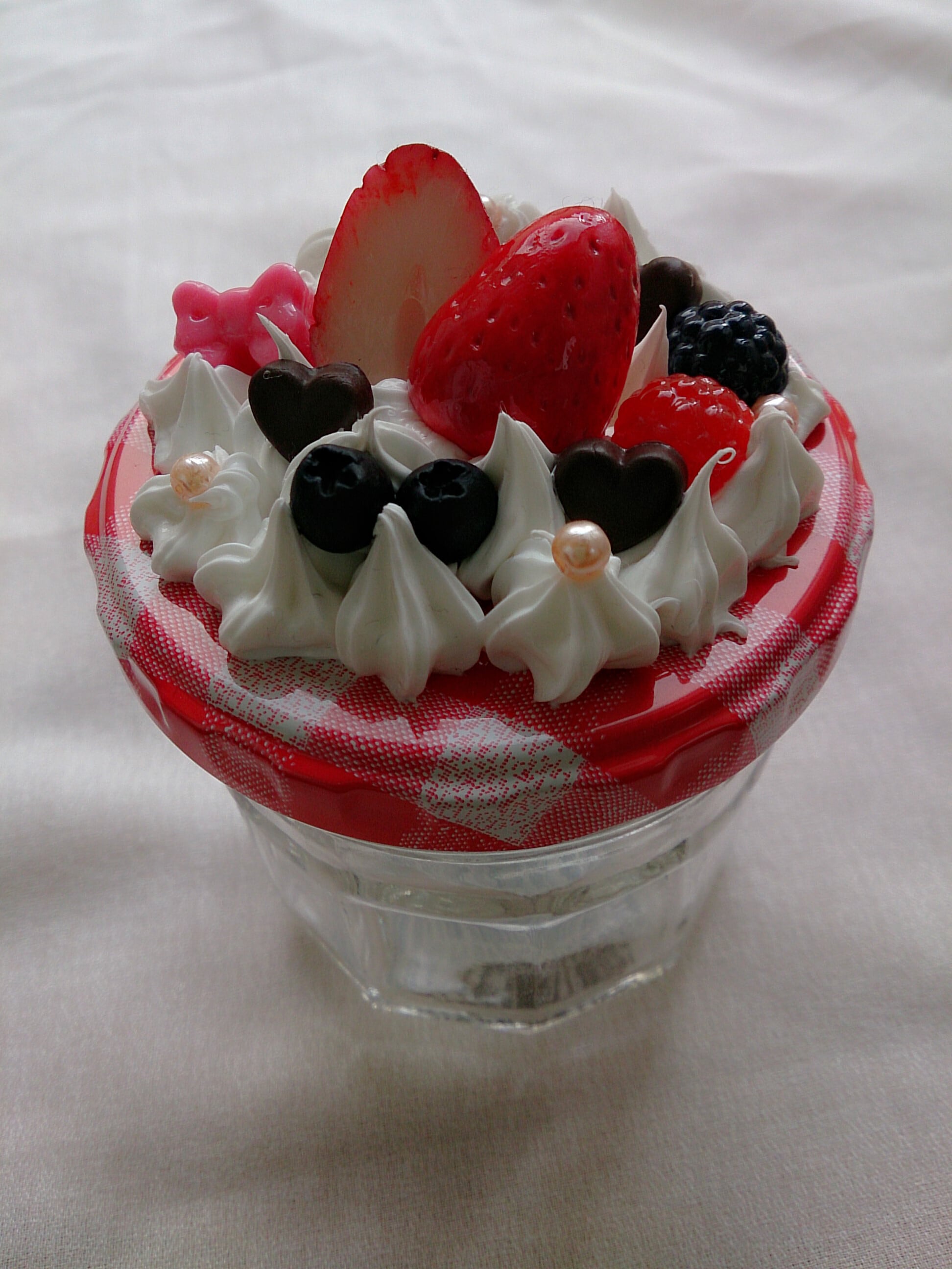 ジャムポットに樹脂粘土で作ったスイーツをいろいろデコしました。 内容量200ml 高さ13cm