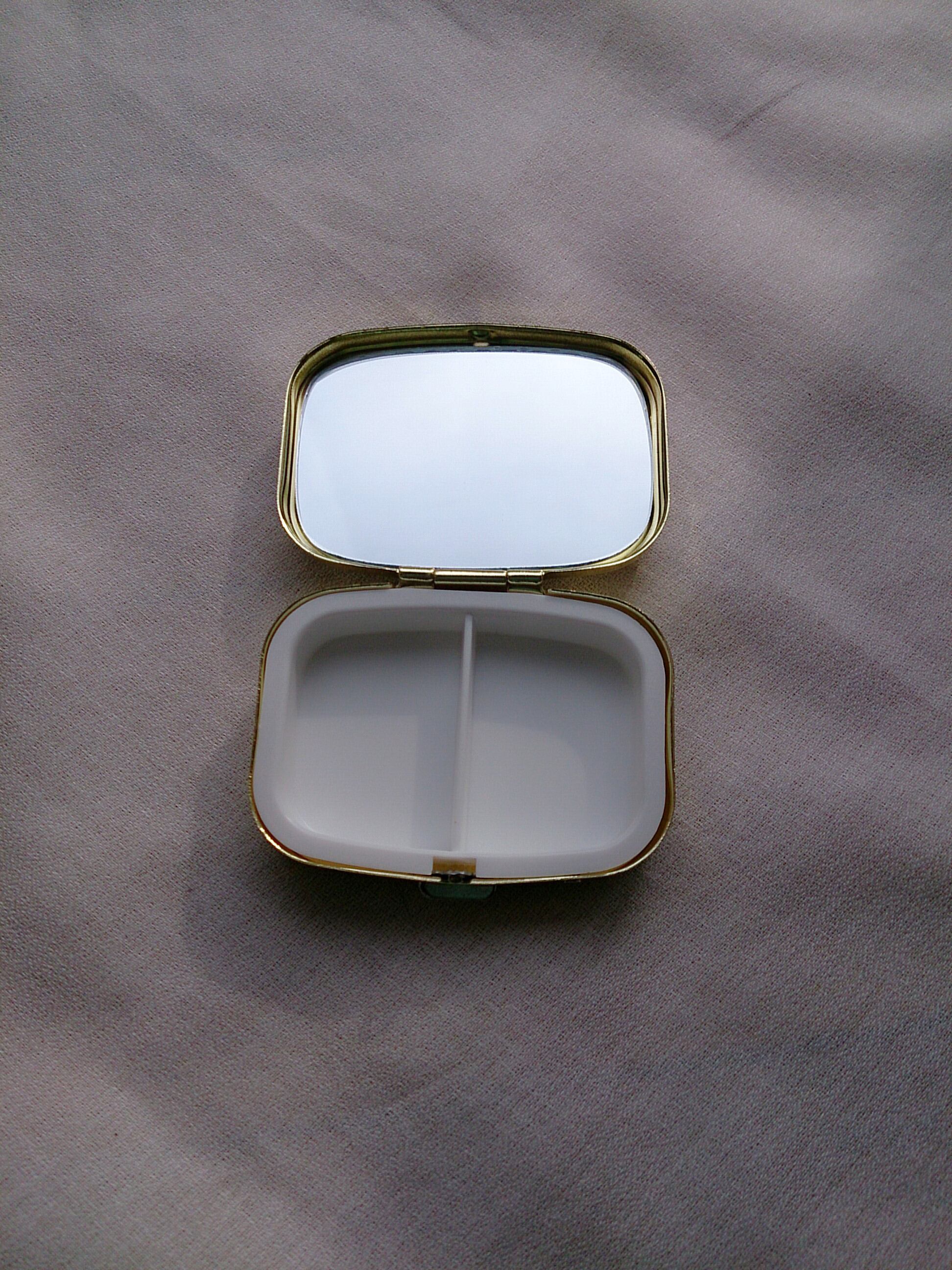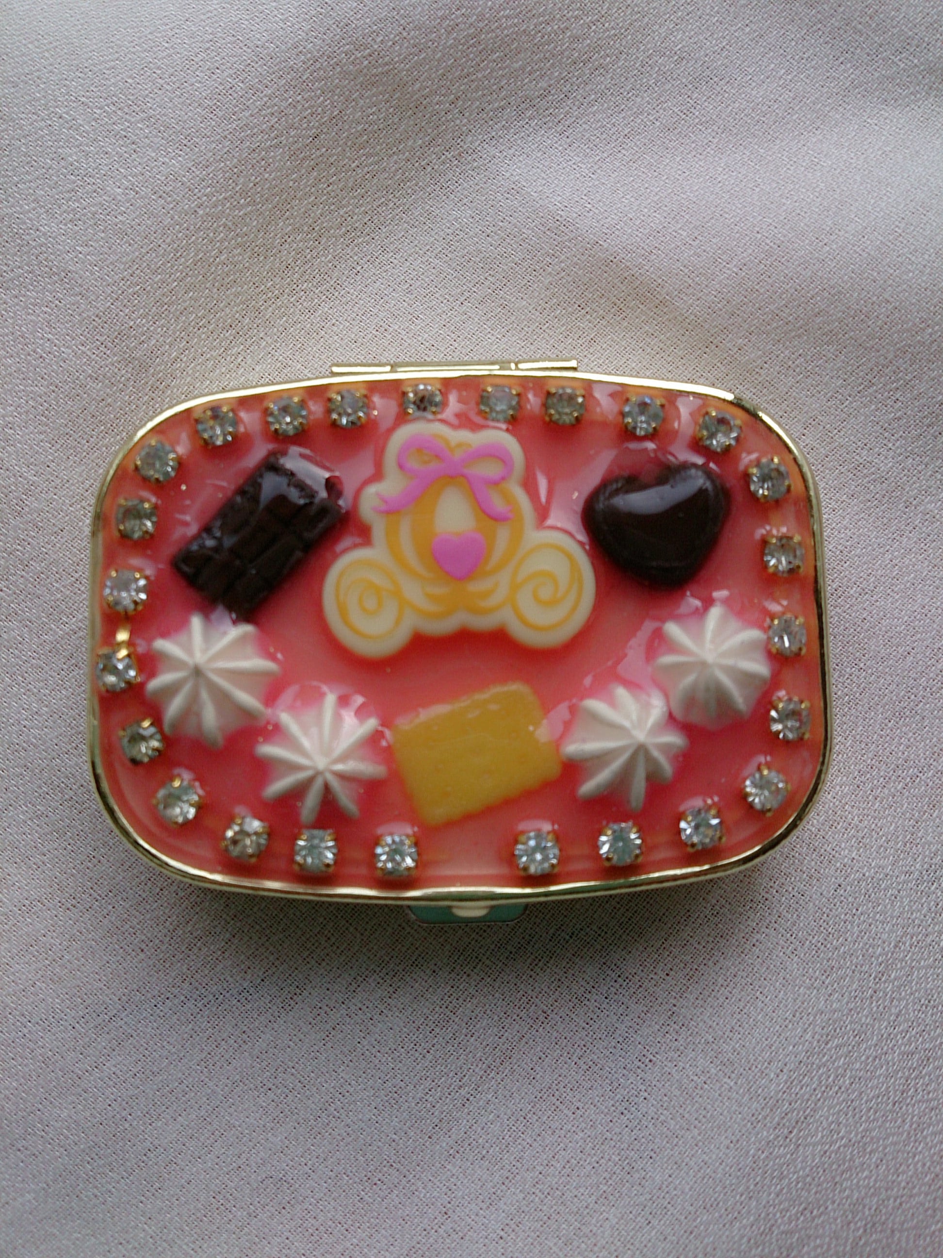 ピルケースに樹脂粘土で作ったスイーツをUVレジンで閉じ込めました。 フタの内側にはミラーが付いていて便利です。 4cm×5.5cm