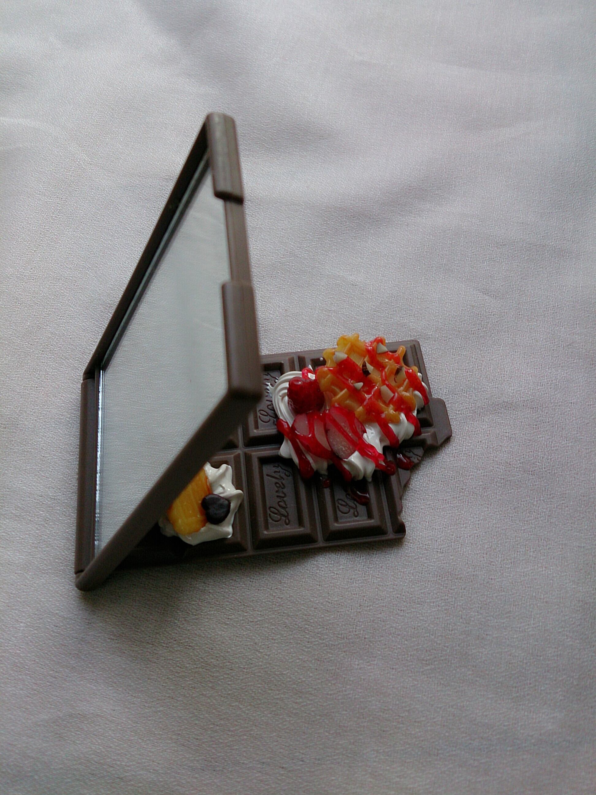 少しかじった感じのかわいい板チョコ形のスタンドミラーに、樹脂粘土で作ったスイーツをデコしました。 8.5cm×5.3