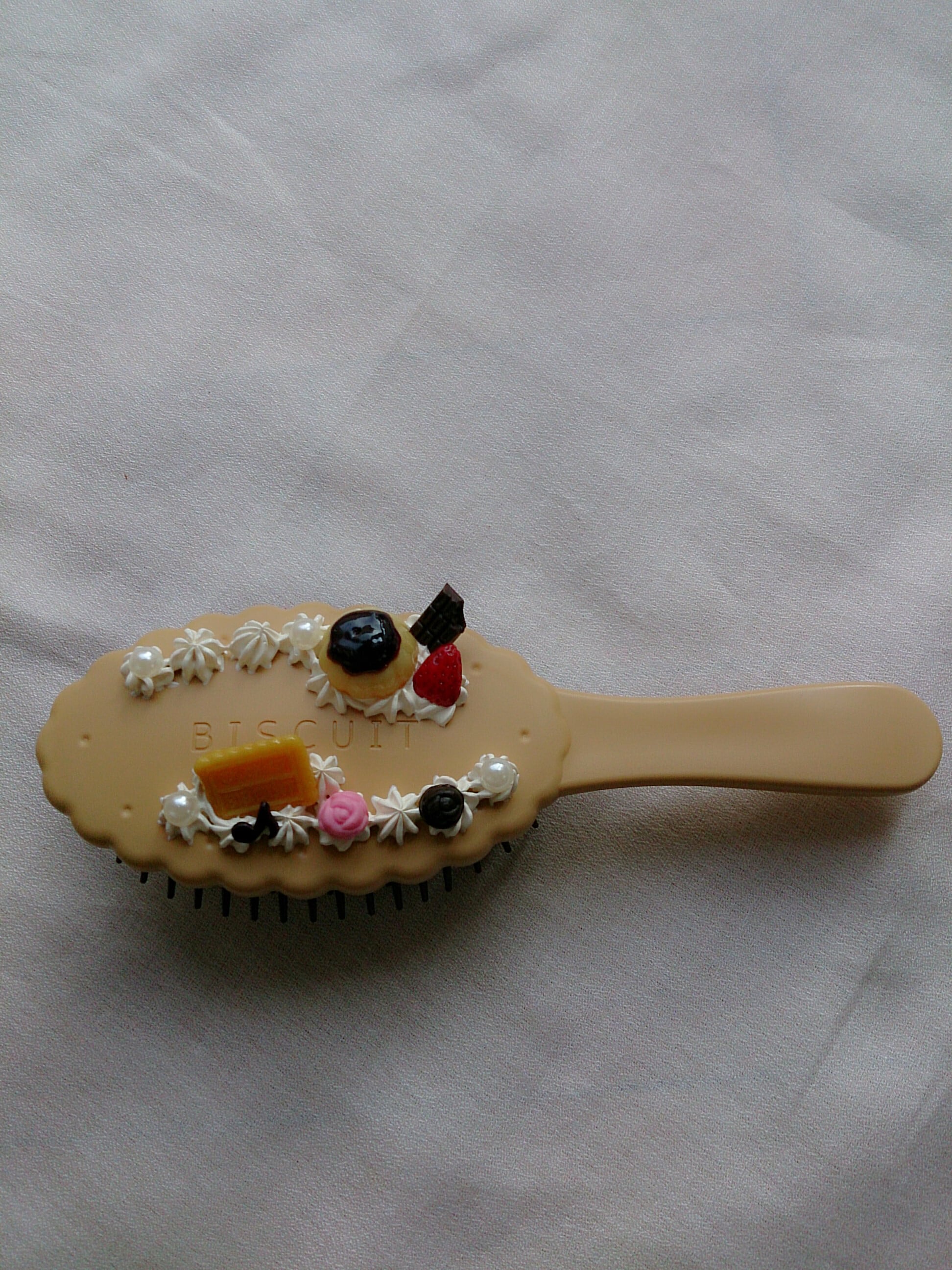 ビスケット形モチーフのヘアブラシに樹脂粘土で作ったスイーツをデコしました。