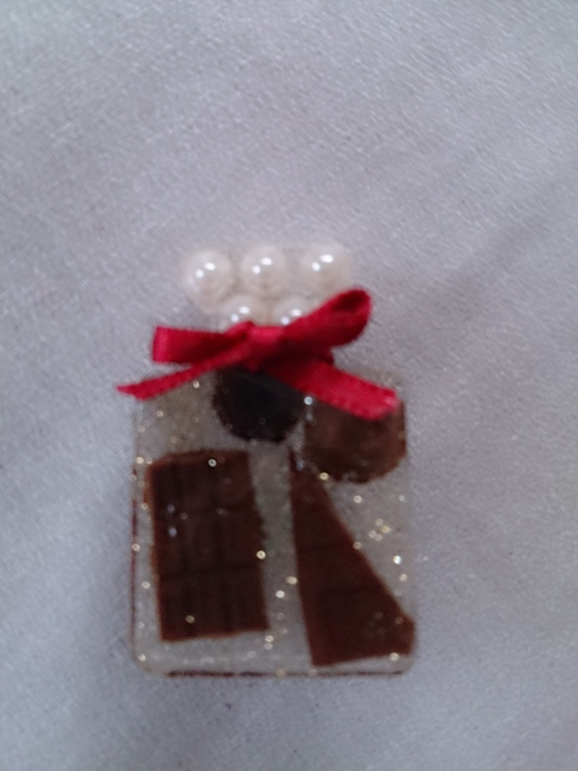 樹脂粘土で作ったチョコレートをUVレジン液で閉じ込め、リボンを結びました。