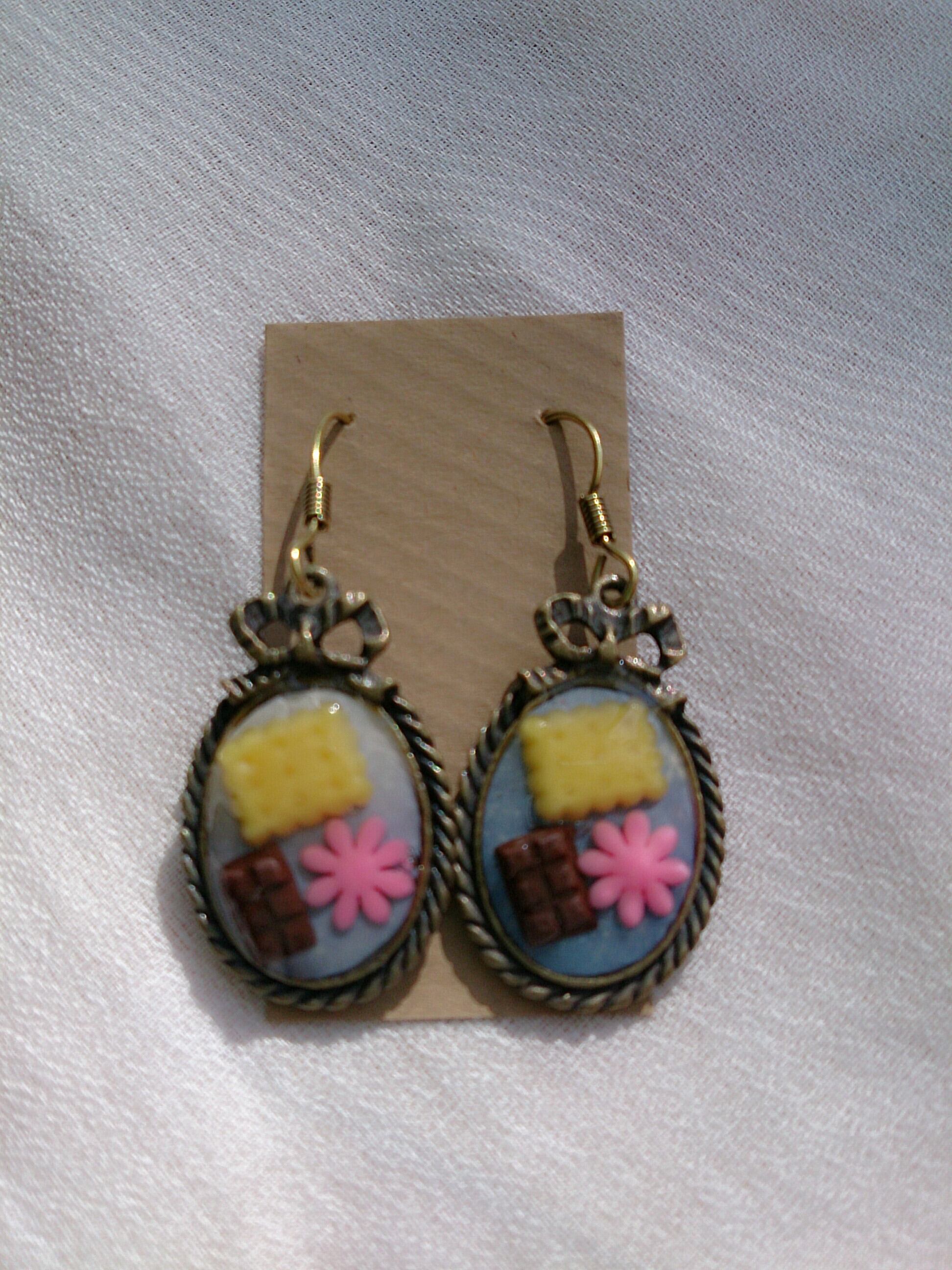 アンティークチャームに樹脂粘土で作ったスイーツをUVレジンで閉じ込めフック形のピアスにしました。 2.4cm×1.6cm